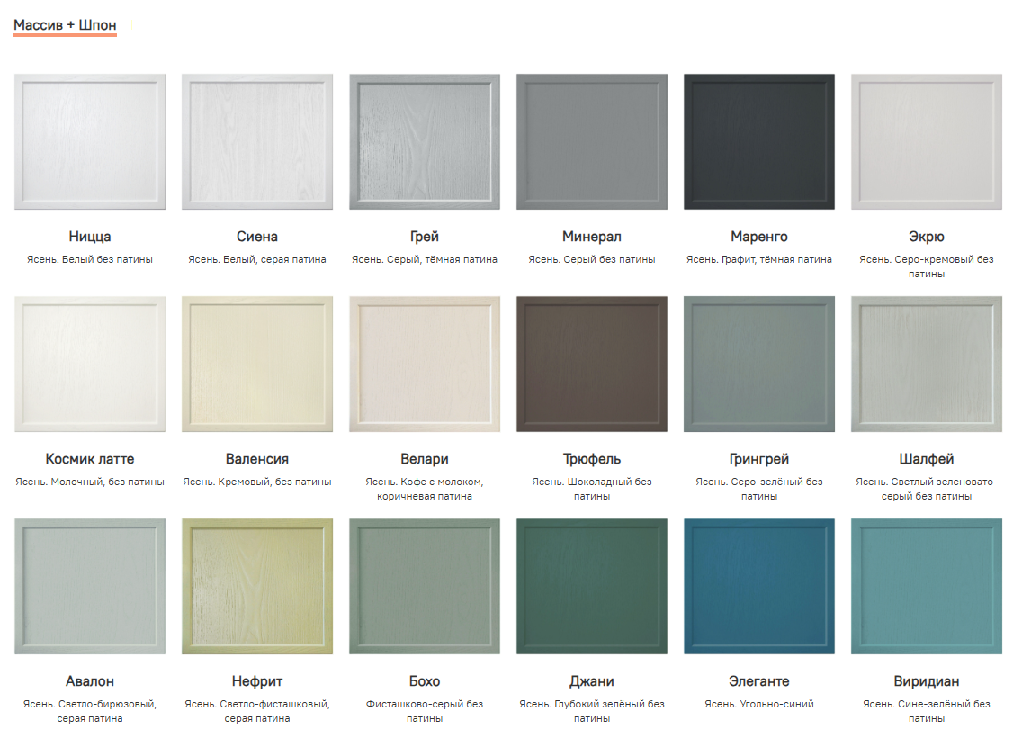 - Материал фасада: МДФ краска, Массив + Шпон